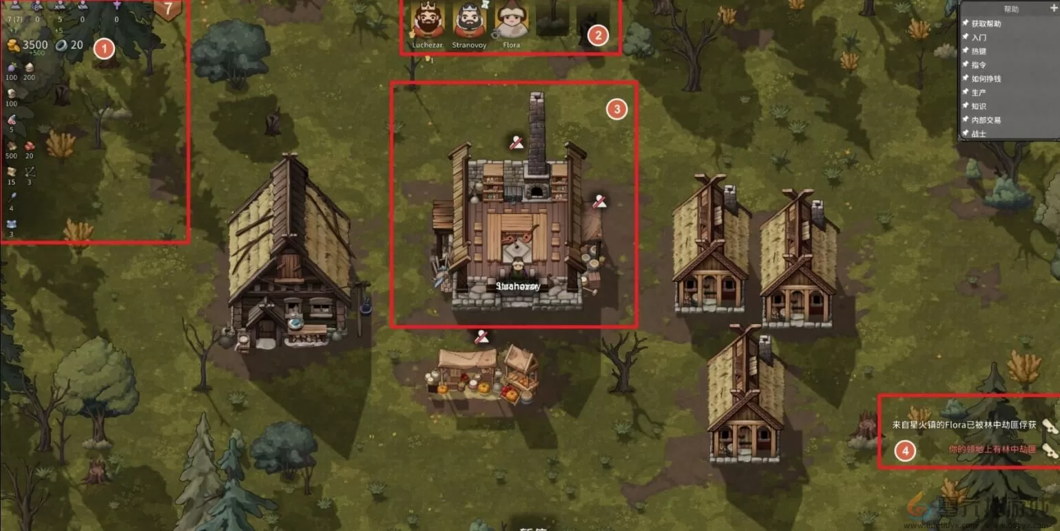 诺兰德主界面选项功能一览主页面图览①左上角包含了人口数量、金钱数量、素材数量,人口栏右侧的7是当前有...